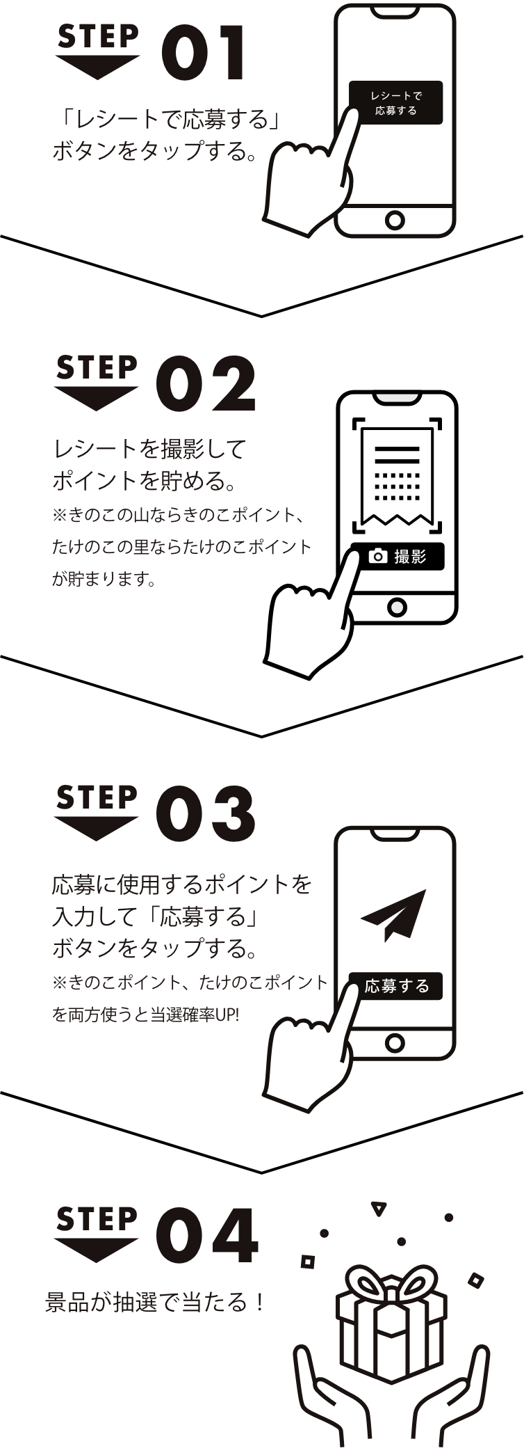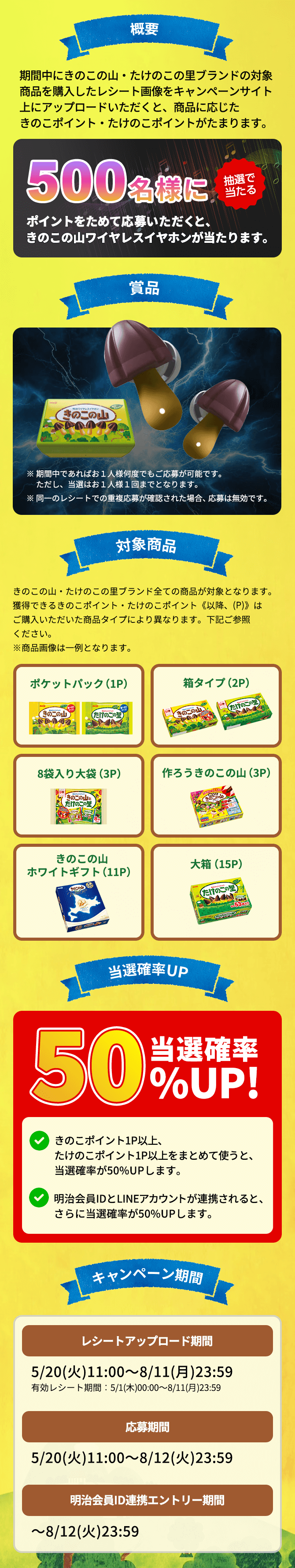 ※きのこポイント1P以上とたけのこポイント1P以上とを組み合わせて応募すると、当選確率が50% UPします。